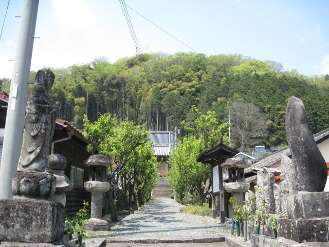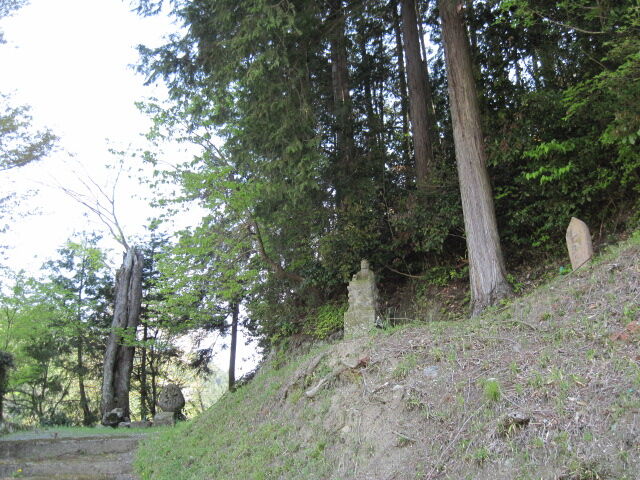 石段上に橘逸勢の墓と伝える石塔、娘の妙冲尼(みょうちゅうに)の孝行を称えた旌孝(せいこう)碑がある。