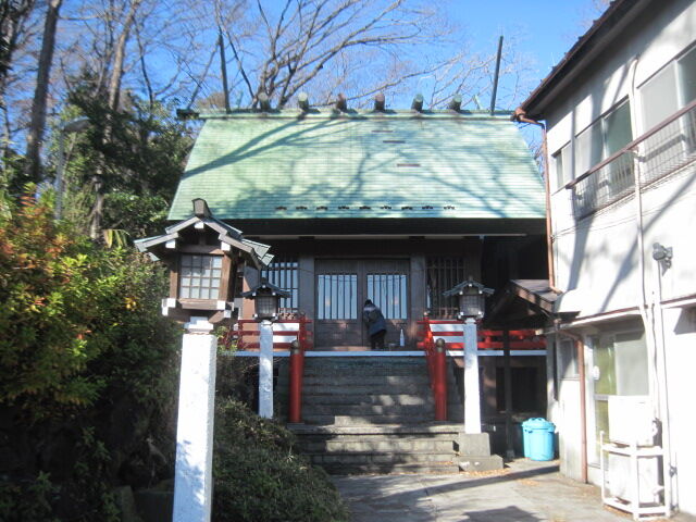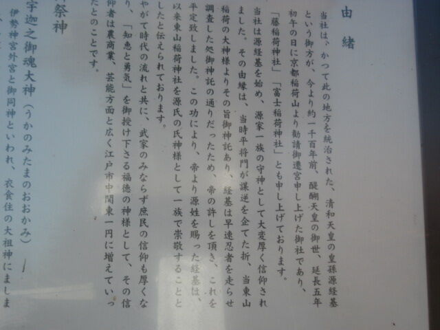 『江戸自慢三十六興 (落合ほたる)』・『江戸名所図会(落合蛍)』源経基が、延長5年(927)に京都稲荷神社を勧請して、東国源氏の氏神として祀ったと伝える。かつては境内に大きな藤の木があったそうだ。