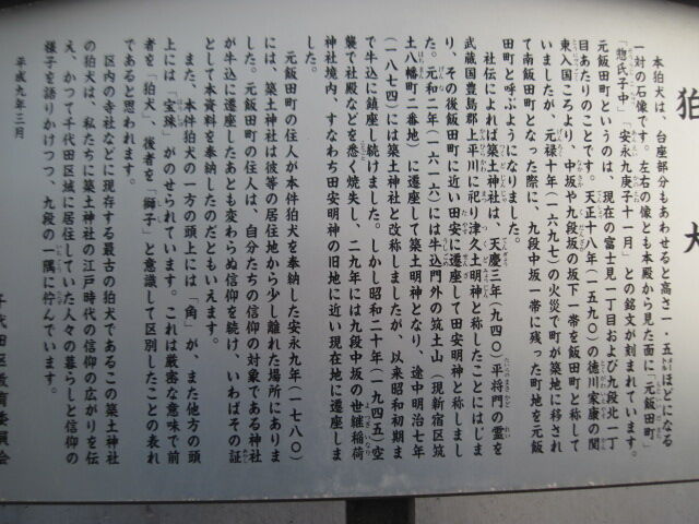 天慶3年(940)、将門の霊を武蔵国豊島郡上平川に祀り、津久土明神と称したことにはじまるという。狛犬の頭上には「角(つの)」が乗る。すごい人出だ。冬至から節分までの間だけ授与される「一陽来復御守」目当ての参拝客だろうか。承平年間(931~37)の藤原秀郷の開基で、戦勝祈願のため念持仏である毘沙門天像(現存しない)を安置したという。